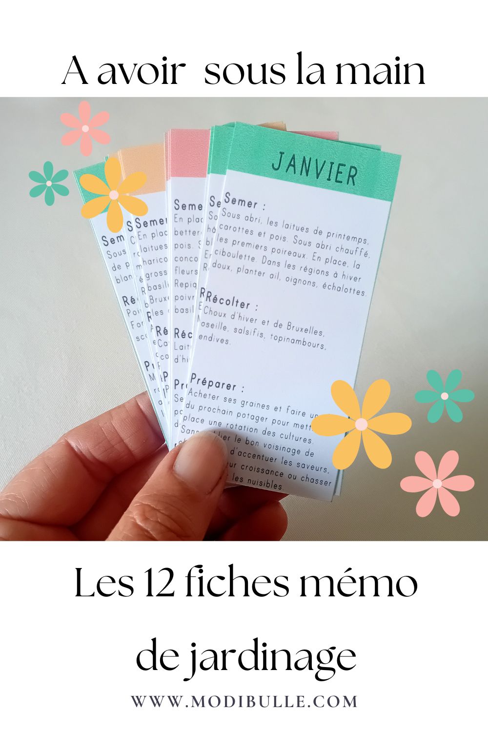 Au début, j’étais comme toi, mais à force de lire et d’expérimenter, après toutes ces années, j’ai trouvé une super astuce que je te partage aujourd’hui : il s’agit d’un mémo de 12 petites fiches de jardinage à garder sous la main pour pouvoir en un coup d’oeil savoir quoi faire chaque mois de l’année !
